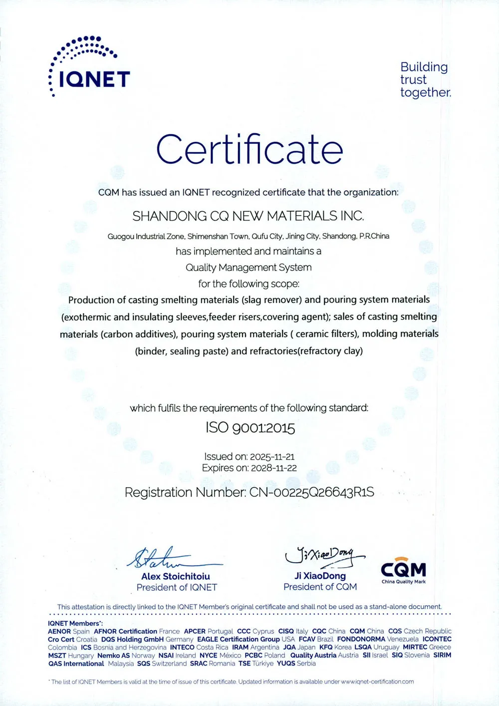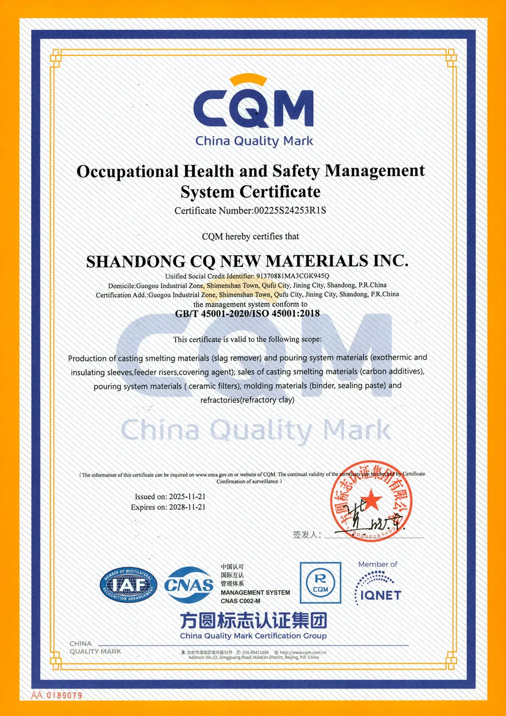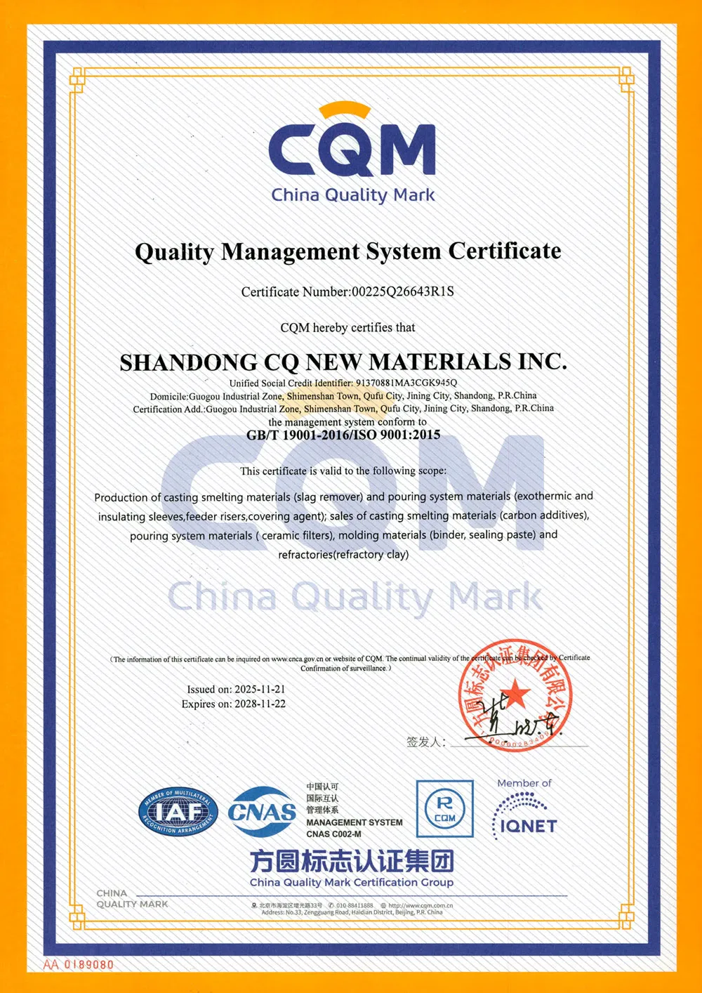 АО Шаньдун Чуньцю Новые Материалы – это национальное высокотехнологичное предприятие, специализирующееся на исследованиях, разработке и производстве литейных материалов. Основная продукция компании включает шлакоудалители, экзотермические прибыли и другие вспомогательные литейные материалы. Компания является известным брендом в отрасли, обладающим возможностями индивидуального производства по полному технологическому циклу: холоднотвердеющие смеси, горячетвердеющие смеси и вакуумно-пленочная формовка. Предприятие расположено в городе Цюйфу провинции Шаньдун – на родине конфуцианской культуры. Регион отличается удобной транспортной и логистической доступностью: через него проходят скоростные автомагистрали Пекин – Фучжоу, Жичжао – Ланькао, а также железнодорожная магистраль Пекин – Шанхай. Благодаря возможности контейнерных перевозок по железной дороге со станции Яньчжоу, а также морских контейнерных перевозок через порты Циндао и Жичжао, компания может эффективно снижать логистические затраты клиентов.
